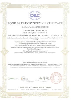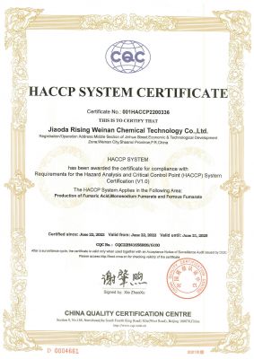公司證書公司通過了ISO9001:2015、HACCP認(rèn)證和FSSC22000等質(zhì)量安全管理體系認(rèn)證。